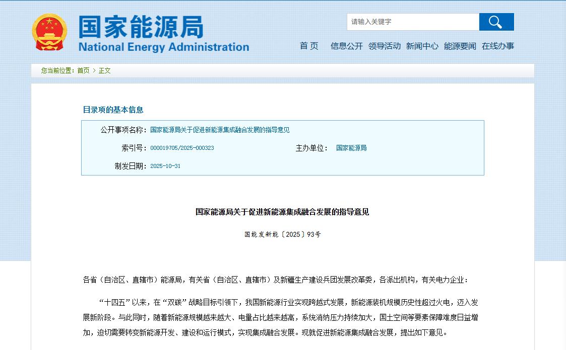 国家能源局关于促进新能源集成融合发展的指导意见