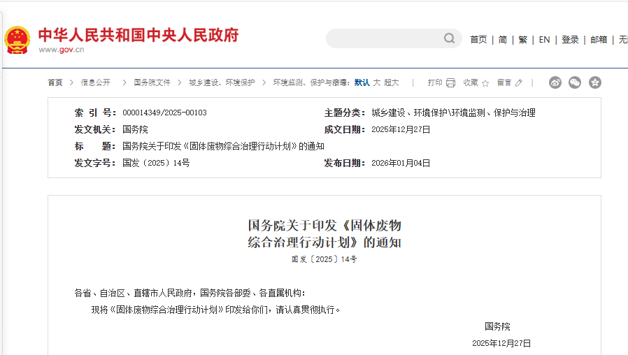 新华社北京1月4日电 日前国务院印发《固体废物综合治理行动计划》(以下简称《行动计划》)。